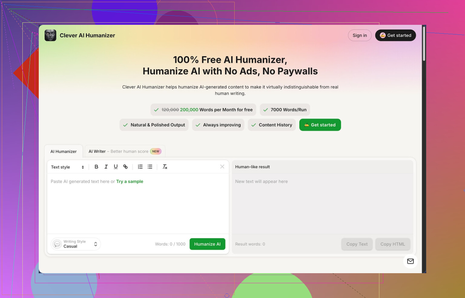 Clever Ai Humanizer est probablement l’alternative gratuite la plus pratique à TwainGPT en ce moment pour du travail en volume. Le quota gratuit est bien plus généreux, et le mode Casual casse vraiment cette cadence rigide typique de GPT.