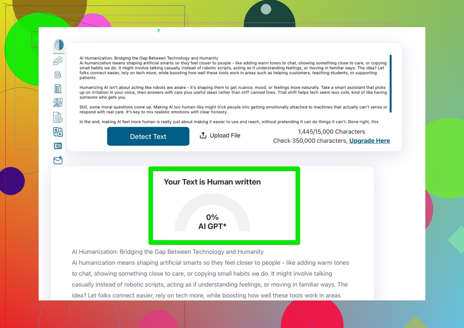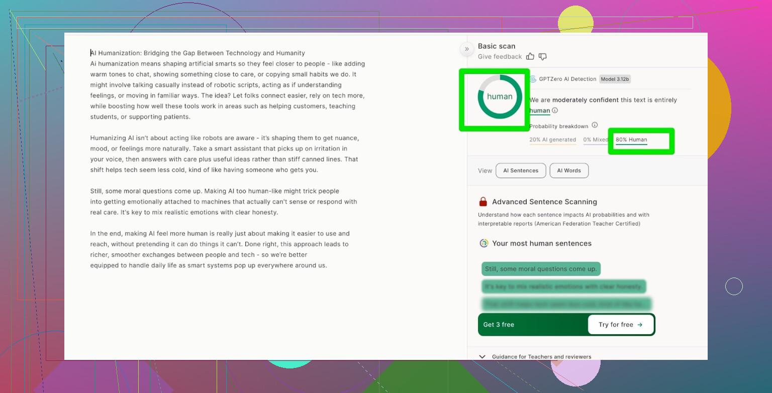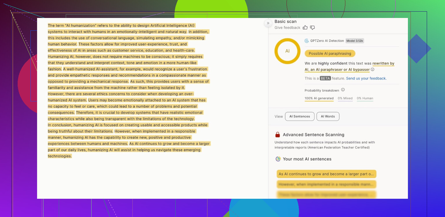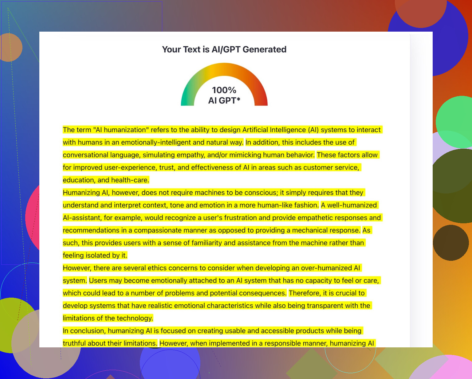 I wrote a full-on essay about “AI humanization” using ChatGPT. Totally unedited, just pure AI-generated blabber. For the curious, here’s how the raw, untouched sample looked when checked by detectors (screenshot time):