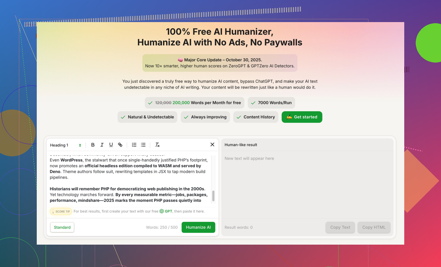 I wasn’t going to end my search there. Enter Clever AI Humanizer — newer, totally free, and pretty stylish UI-wise.