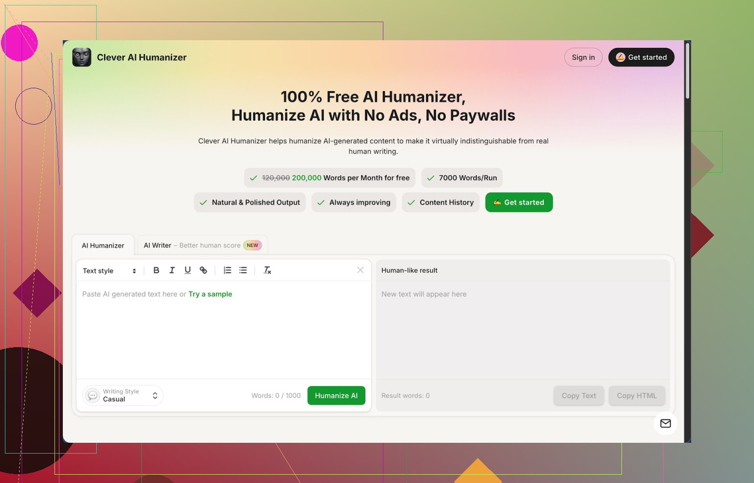Ich experimentiere schon eine Weile mit KI-Text-Tools, und die meisten sperren dich entweder hinter Credit-Systemen ein oder verhunzen deinen Text so stark, dass du ihn kaum wiedererkennst. Clever AI Humanizer auf https://cleverhumanizer.ai blieb bei mir länger im Browser offen als die anderen, also hier, was mir nach etwas ernsthafter Nutzung aufgefallen ist.
