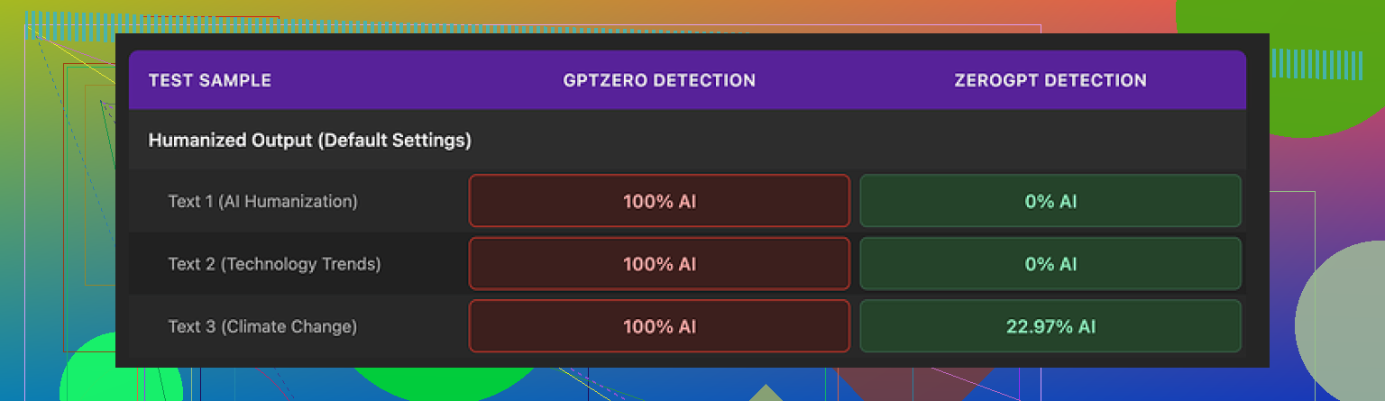 - Every humanized version flagged as 100% AI.