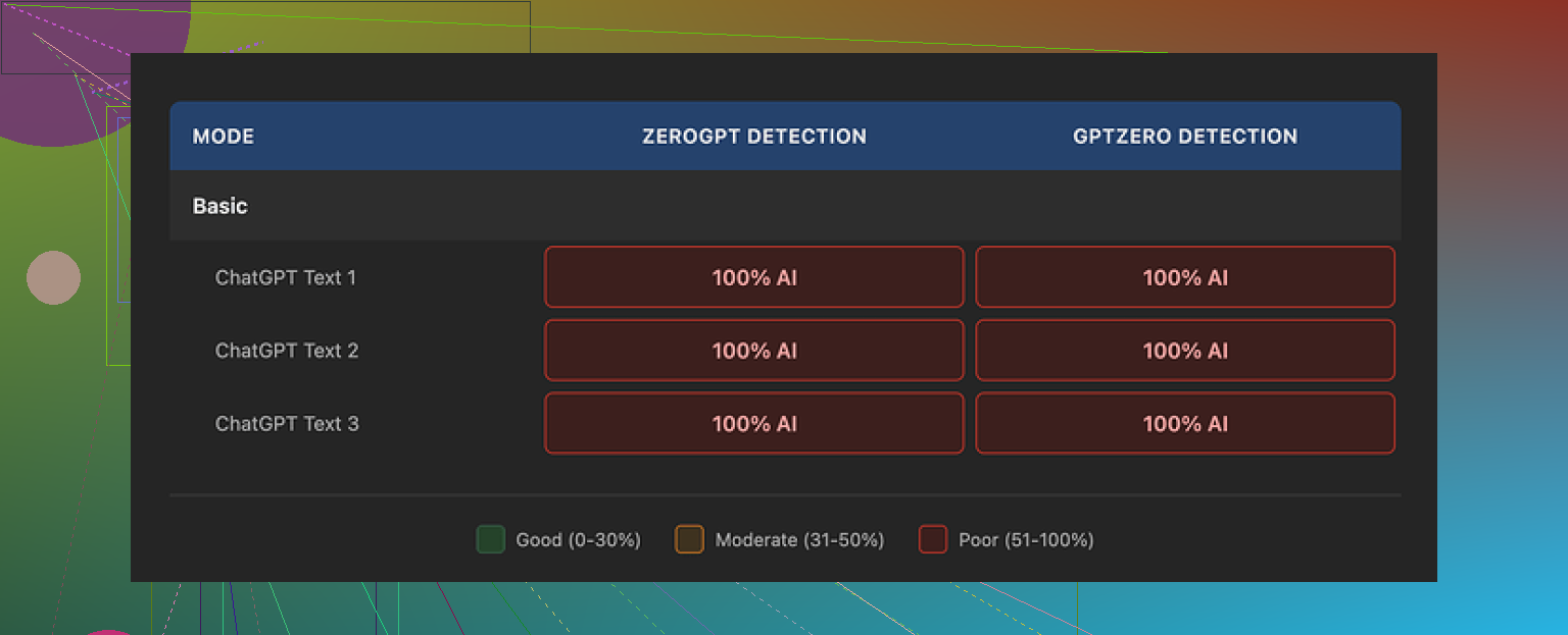 The outputs leaned on tidy, balanced sentences, tidy punctuation, including repeated use of em dashes across multiple samples. Detectors tend to latch onto those patterns.