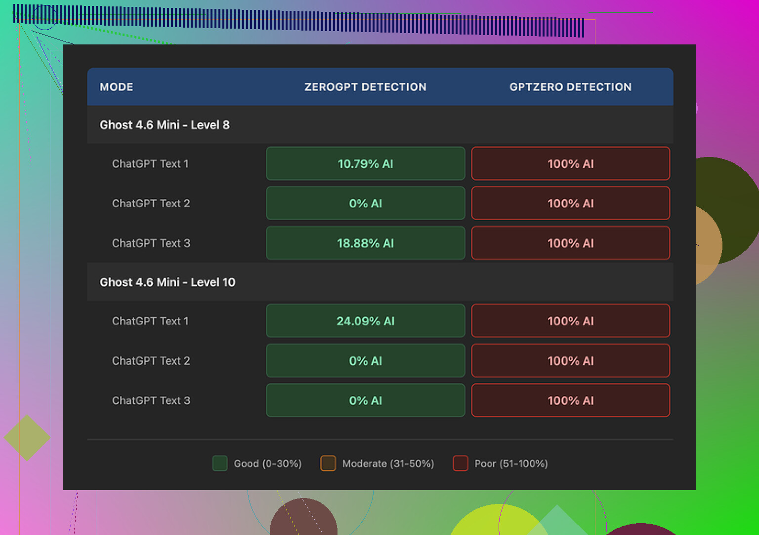 - Some outputs showed 0 percent AI
