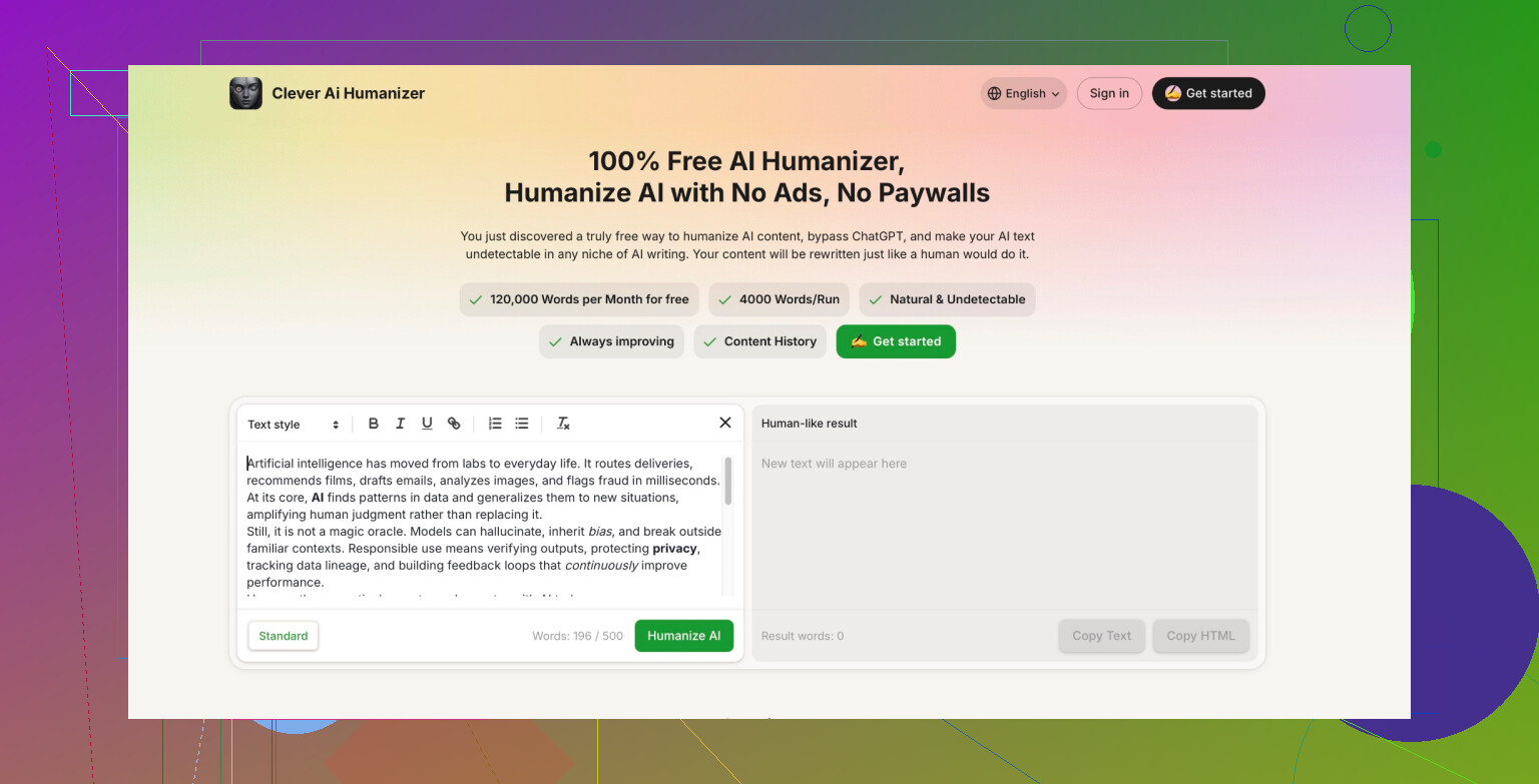 Let me level with you. After looking at pretty much everything out there (yes, including those sketchy tools with the spinning emoji and subscription nags), I keep coming back to Clever AI Humanizer. Wildest thing? It actually doesn’t charge a dime. Not even a “try for free, oops now pay” trick.
